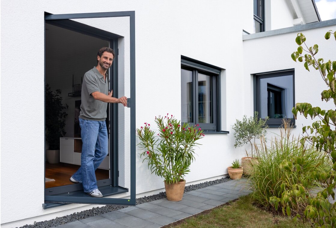 Die Drehtür ist der Dauerbrenner für Balkon und Terrasse: hundertmal am Tag auf und zu, die hält das aus. Bürstendichtungen am Boden dichten zuverlässig ab, auch wenn der nicht ganz eben ist. Wer eine Katze oder einen Hund hat: Eine Tierklappe lässt sich direkt einbauen. Und die schalldämpfende Variante schließt so leise, dass niemand davon aufwacht.