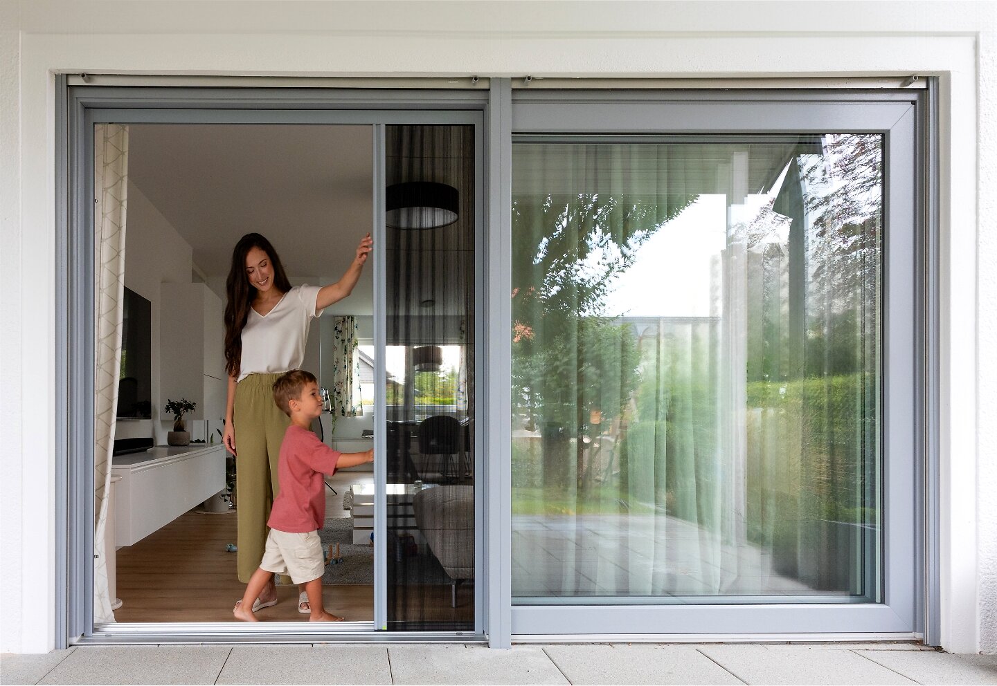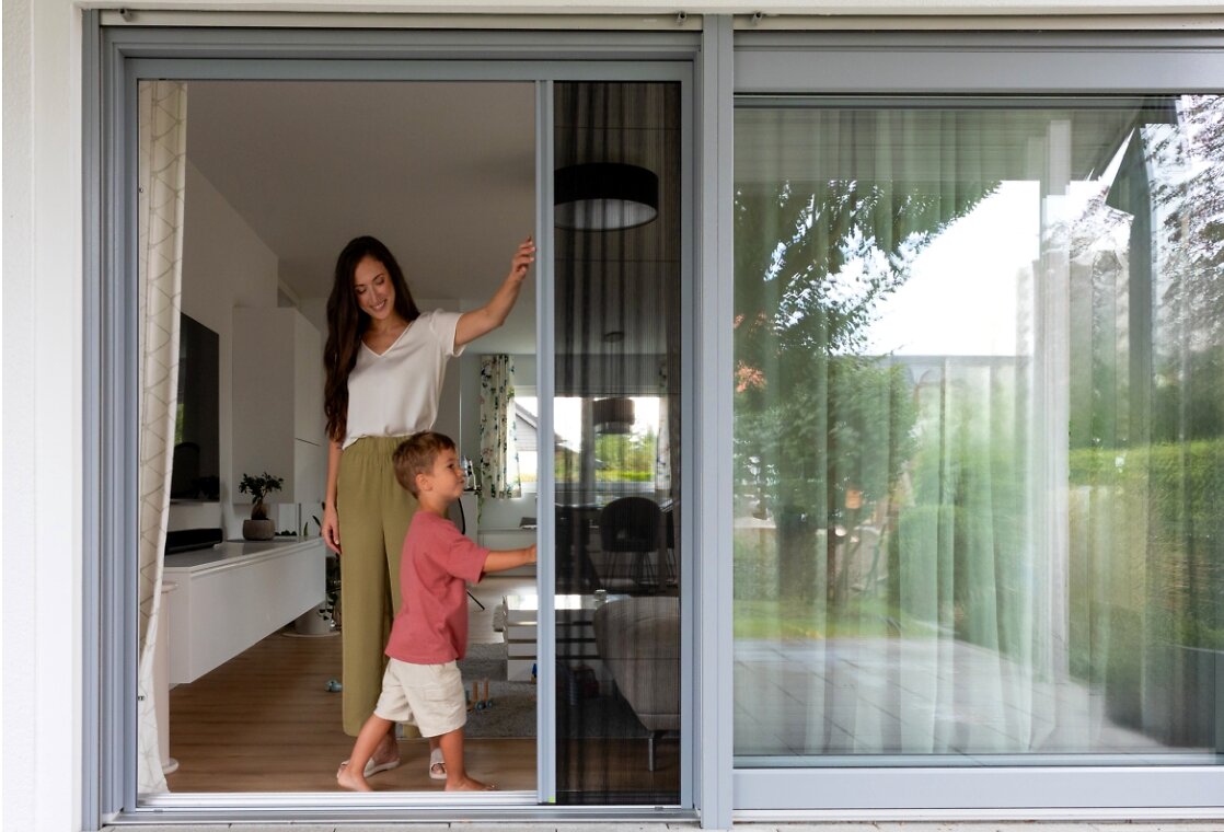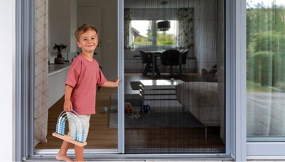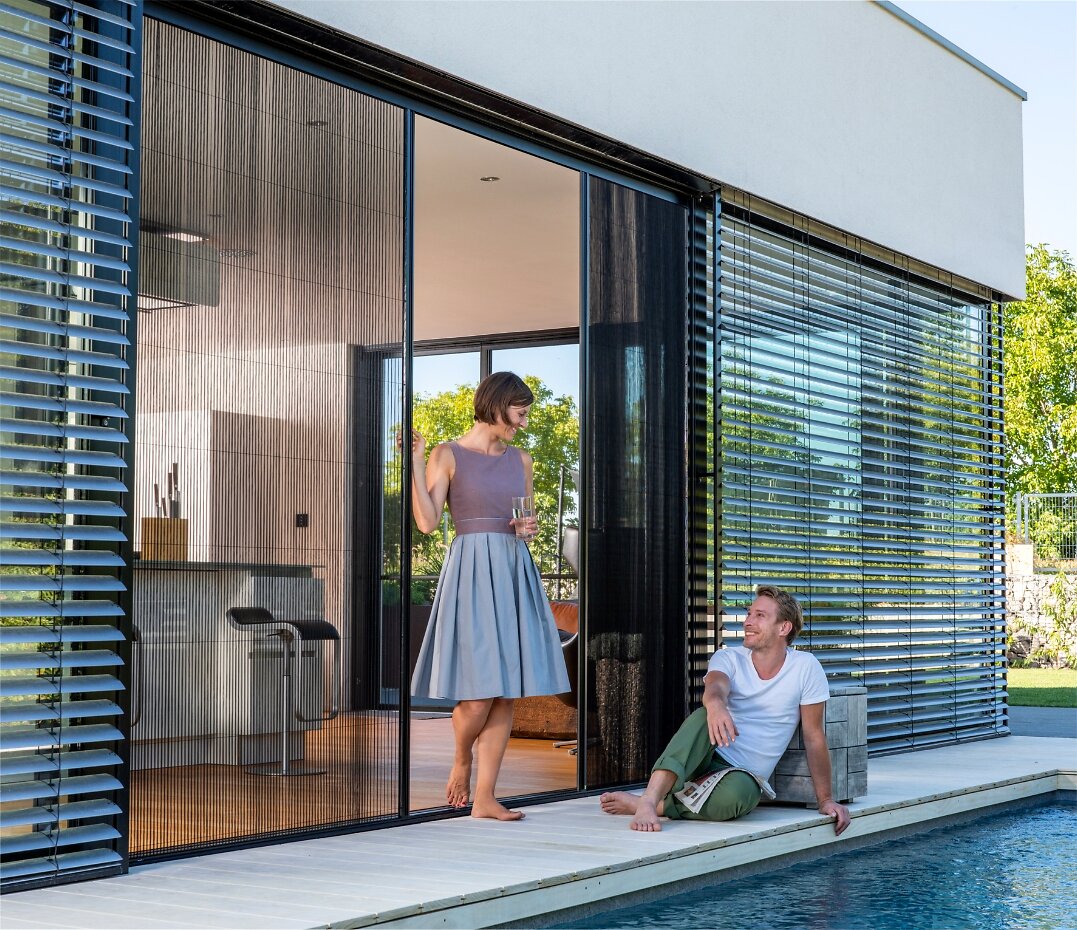 Das Plissee faltet sich zusammen wie eine Ziehharmonika und braucht kaum Platz und keinen Schwenkbereich. Die untere Schiene ist so flach, dass Rollstühle und Kinderwagen problemlos drüberrollen. Für die ganz breiten Hebe-Schiebe-Türen gibt's die zweiflügelige Variante: bis 5 Meter breit. Ausgezeichnet mit dem R+T Innovationspreis in Gold.